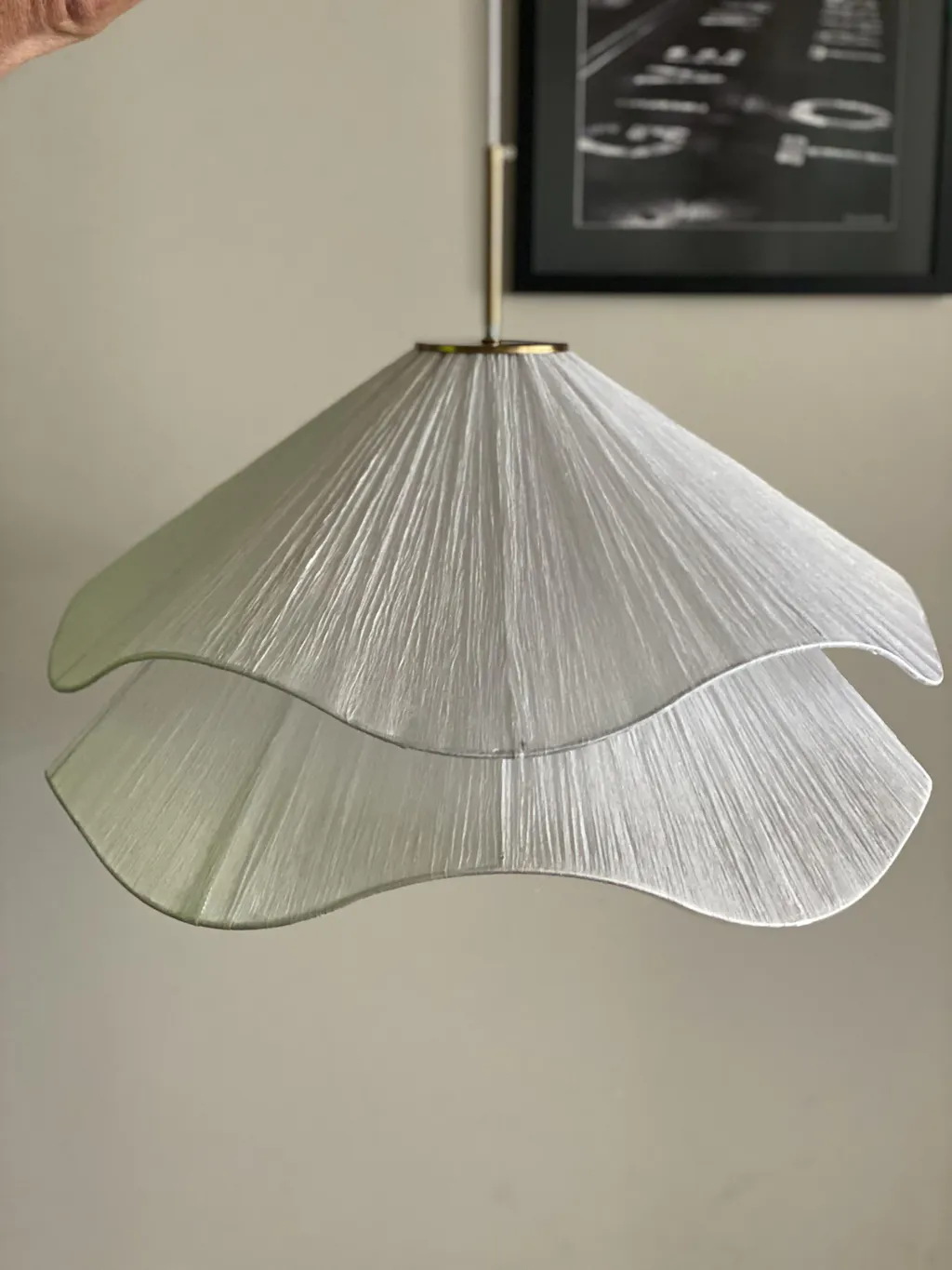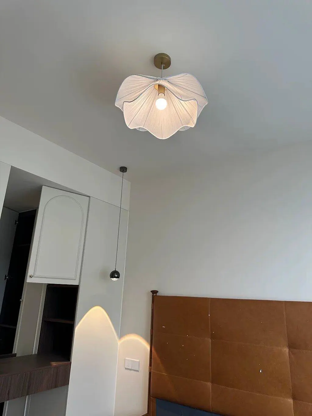 Perfectly suited for a variety of interiors, from cozy bedrooms to chic dining spaces, this Japandi pendant light introduces a tranquil mood with its soft, warm glow and fabric-draped form.