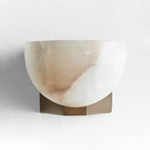 The Halo Alabaster Minimalist Wall Light balances refined elegance with calming minimalism. Featuring a beautifully hand-carved hemispherical alabaster shade, this sconce emits a soft, ambient glow that brings tranquility to your interiors. Anchored by a warm brass backplate, it offers a harmonious contrast between organic translucency and polished metallic sheen.