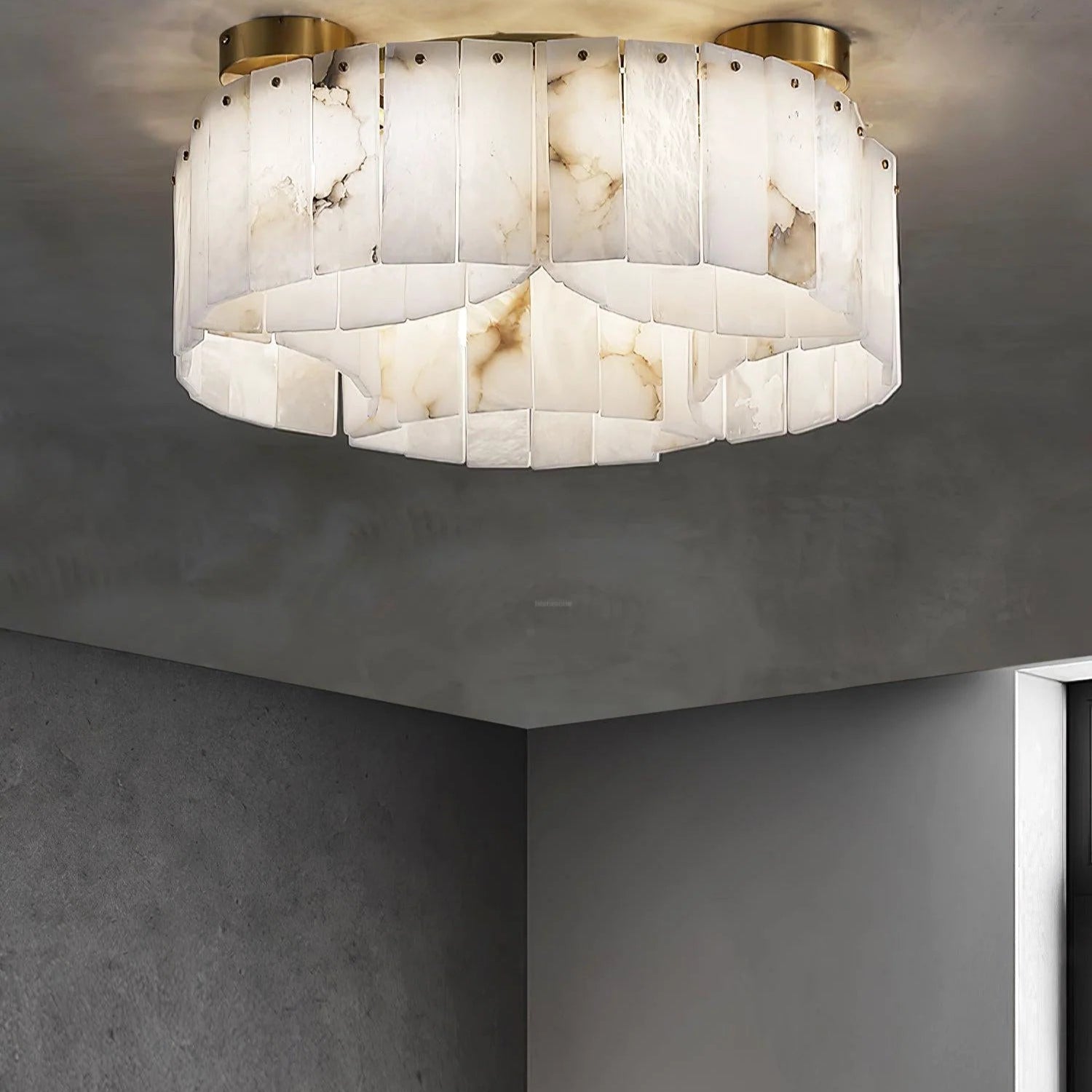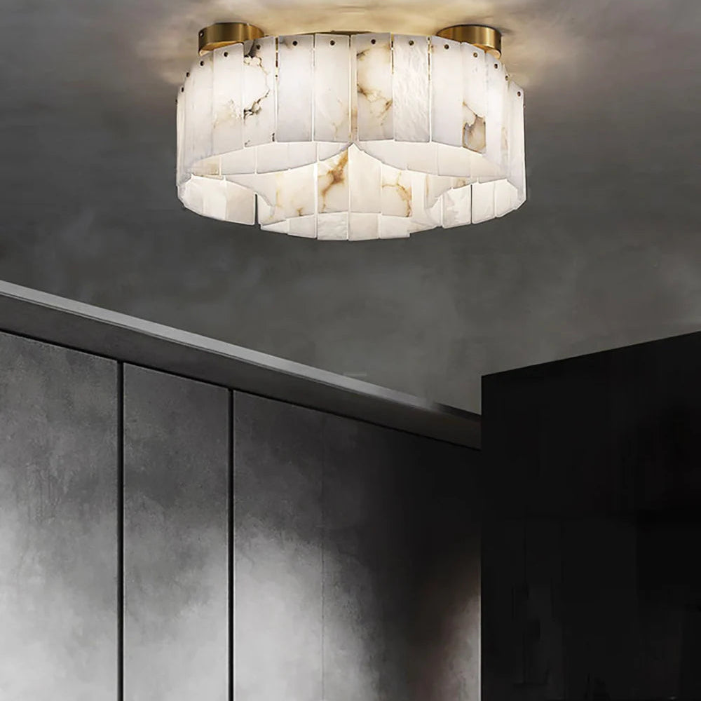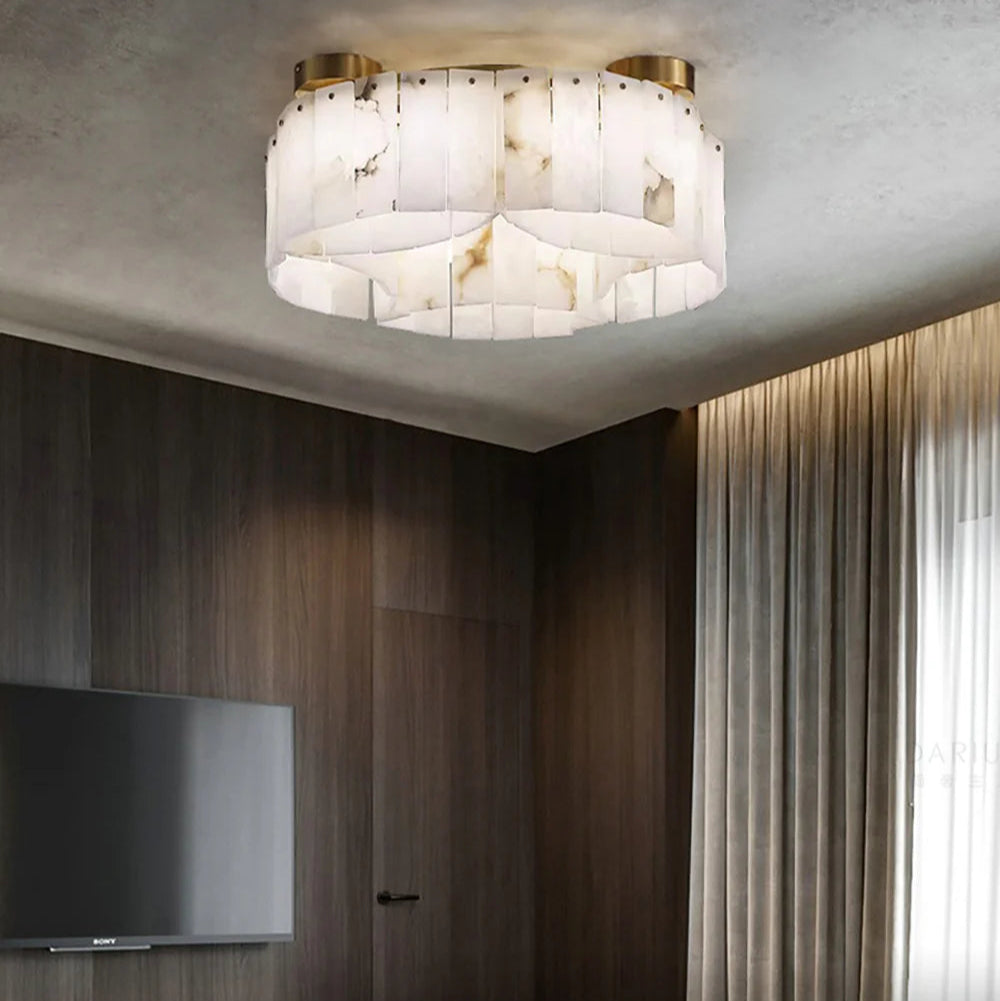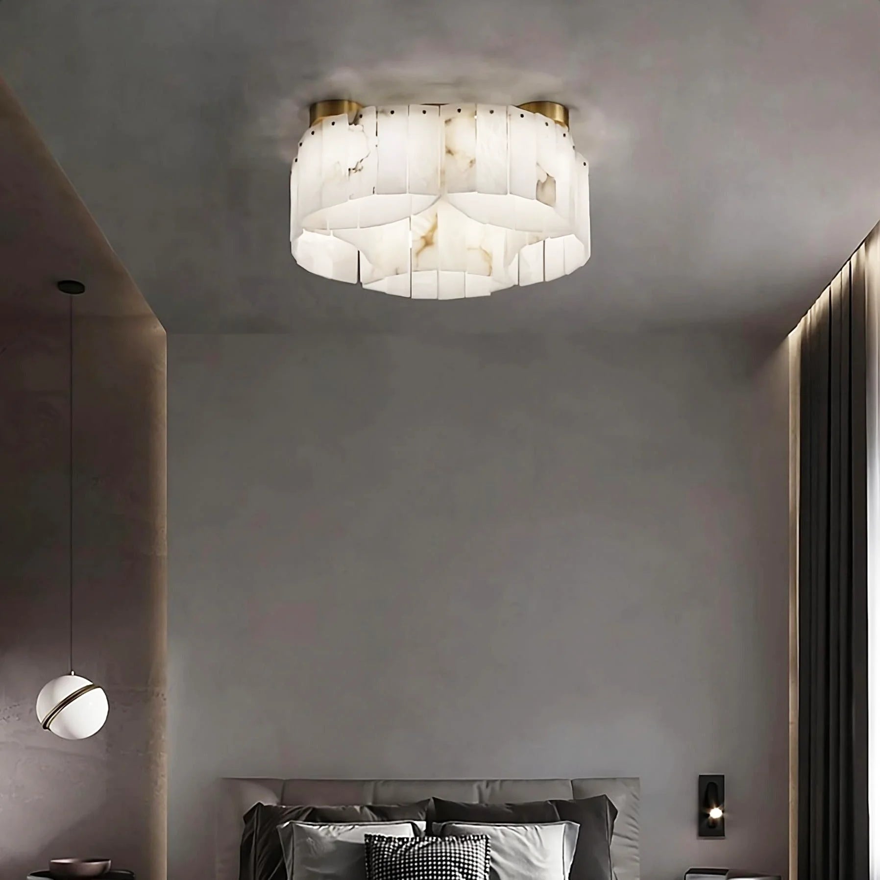 The Serena Halo Alabaster Ceiling Lamp blends architectural sophistication with organic tranquility. Featuring luminous alabaster panels framed in polished brass, this flush-mount fixture creates a sculptural focal point that quietly commands attention. Each panel showcases the natural veining of hand-cut alabaster—subtly glowing to bring ambient warmth and understated luxury to your interior.