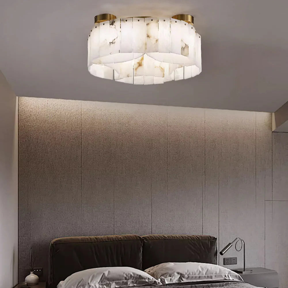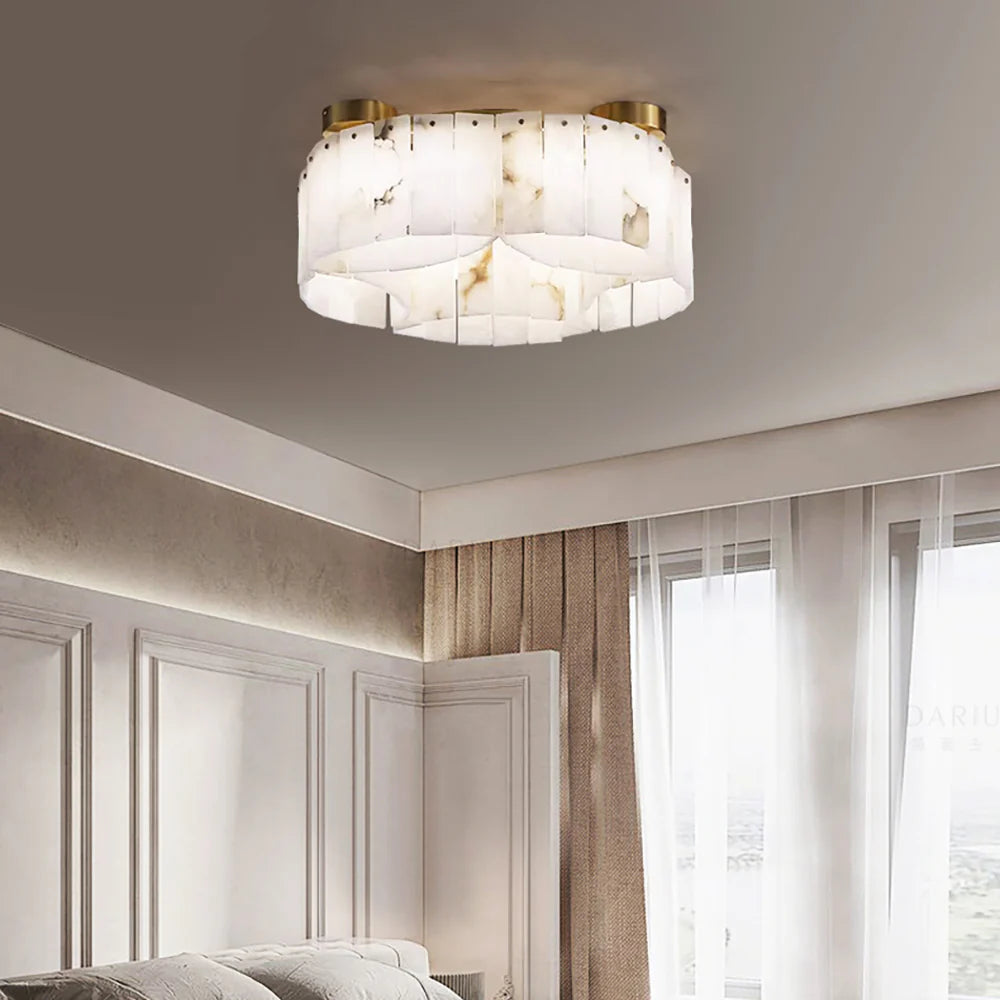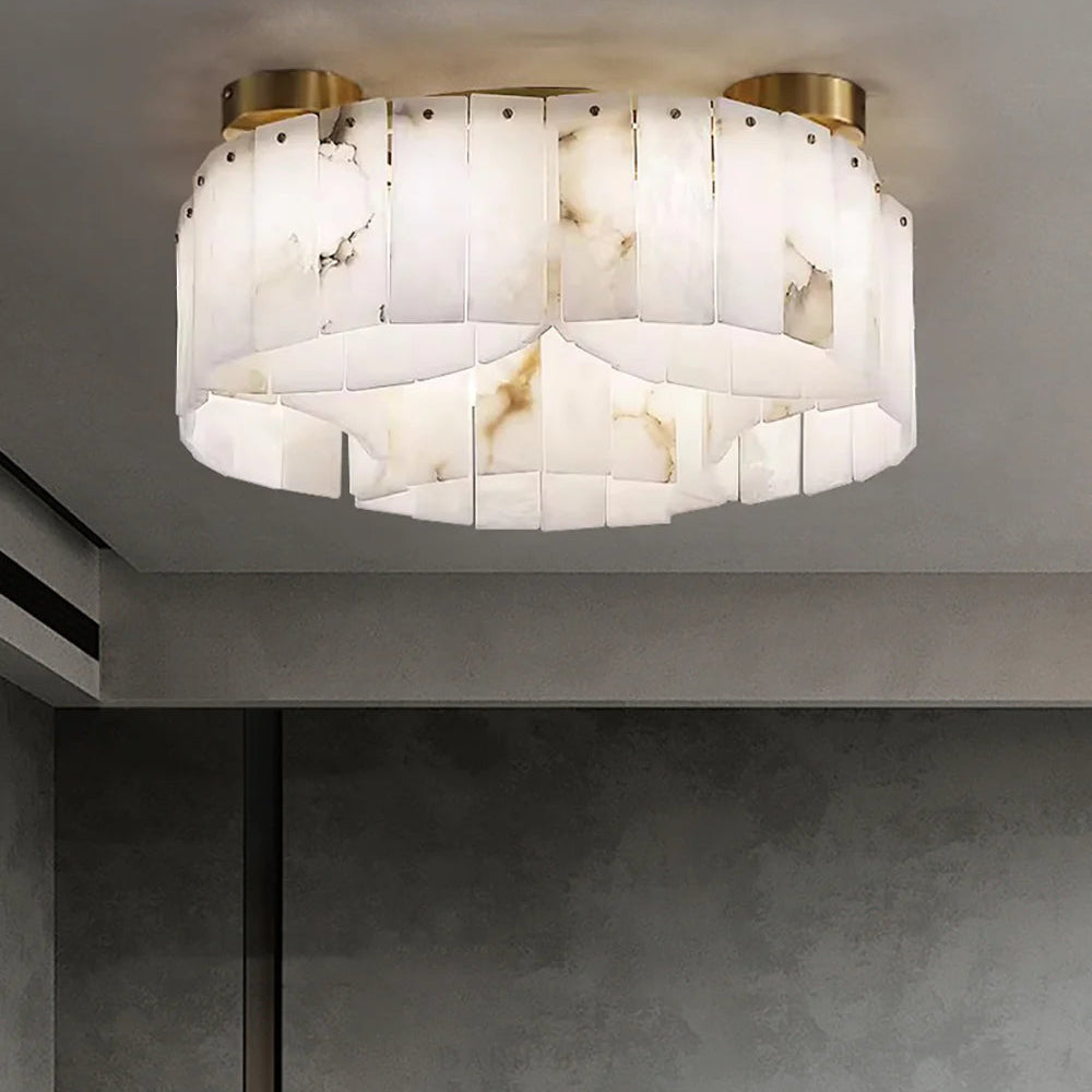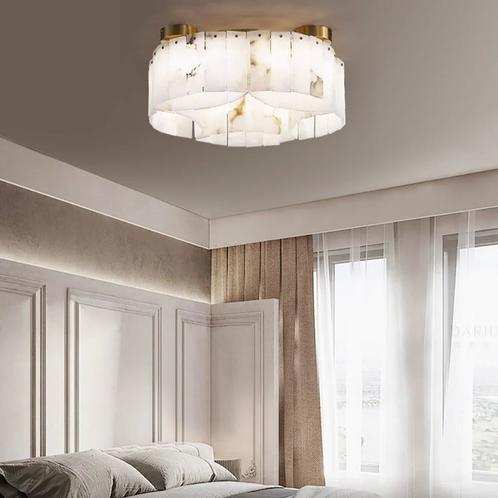 The Serena Halo Alabaster Ceiling Lamp blends architectural sophistication with organic tranquility. Featuring luminous alabaster panels framed in polished brass, this flush-mount fixture creates a sculptural focal point that quietly commands attention. Each panel showcases the natural veining of hand-cut alabaster—subtly glowing to bring ambient warmth and understated luxury to your interior.